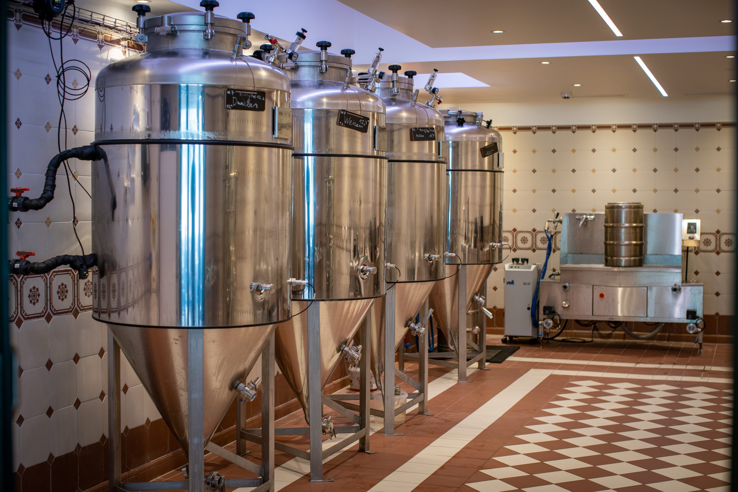2-stufiger-Plattenkühler, Gärung und Reifung für mindestens 6 Wochen in einem der acht 500 Liter Gärtanks