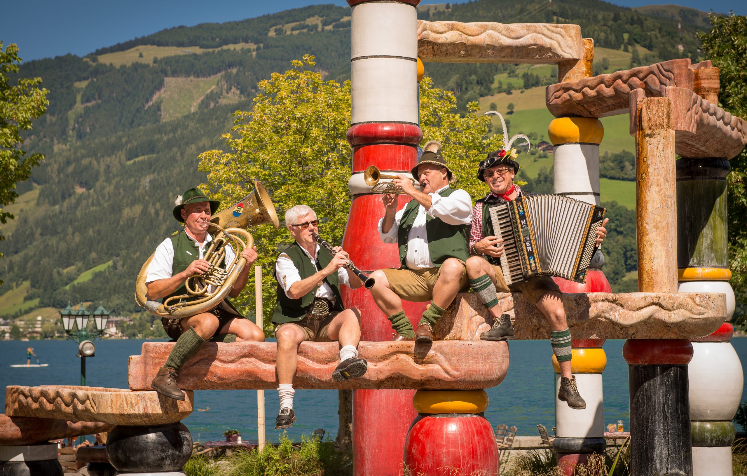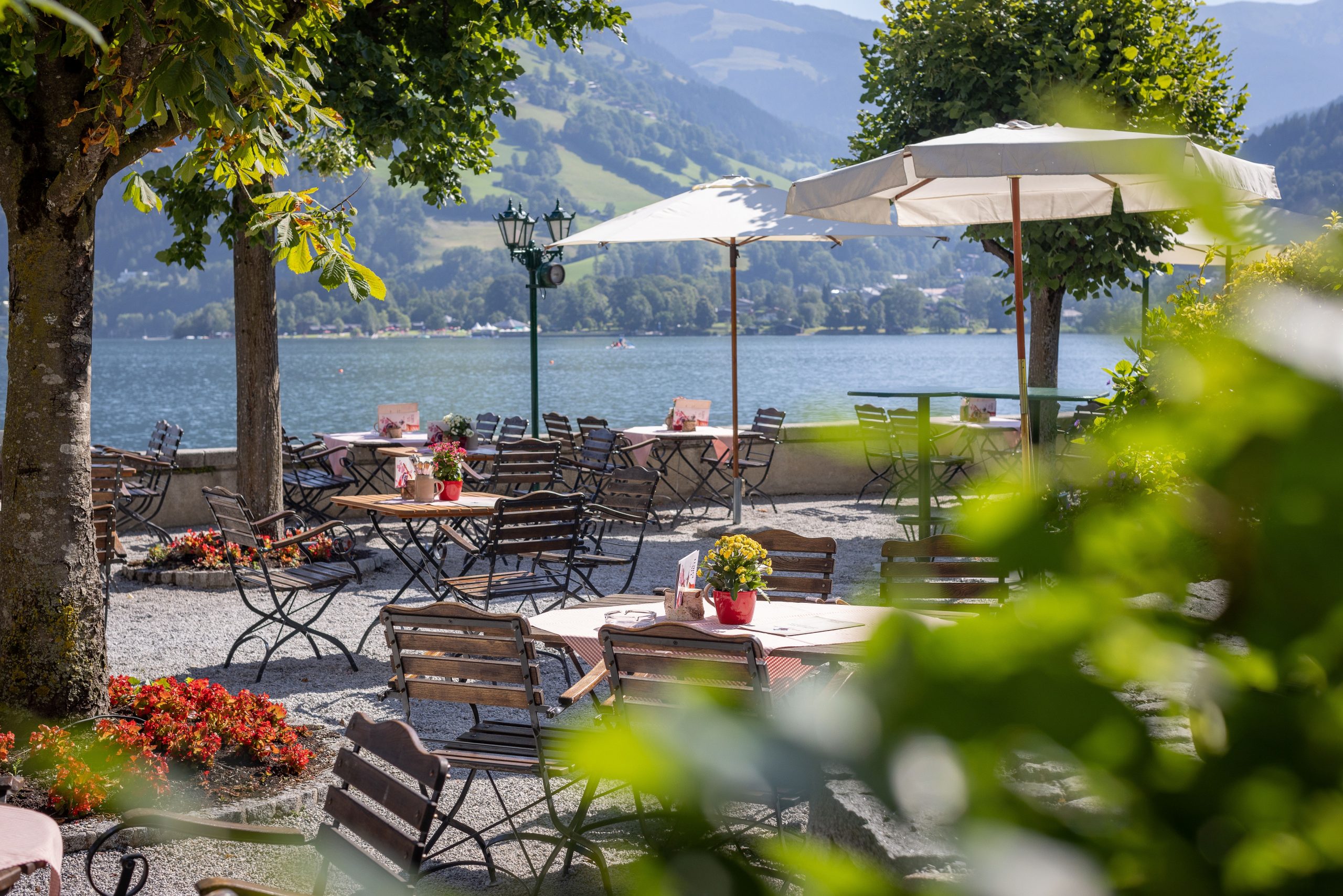 Im Sommer empfiehlt sich das „Pinzga Bräu am See“ mit traumhaftem Gastgarten am See für die Rast bei der Radl- oder Spazierrunde. Hier gibt’s herzhaftes Essen nach der Schifffahrt – dazu servieren wir ein kühles Selbstgebrautes unter den Kastanien mit Blick auf den Hunderwasserbrunnen und die Gipfel des Steinernen Meeres. Auf der Speisekarten stehen regionale Schmankerl und Klassiker der österr. Küche, und natürlich biergerechte Gerichte. Nebenbei backen die GRAND HOTEL-Konditoren noch herrliche Delikatessen, die Sie im Gastgarten am See genießen können. Mehrmals wöchentlich gibts unseren legendären Frühschoppen.
